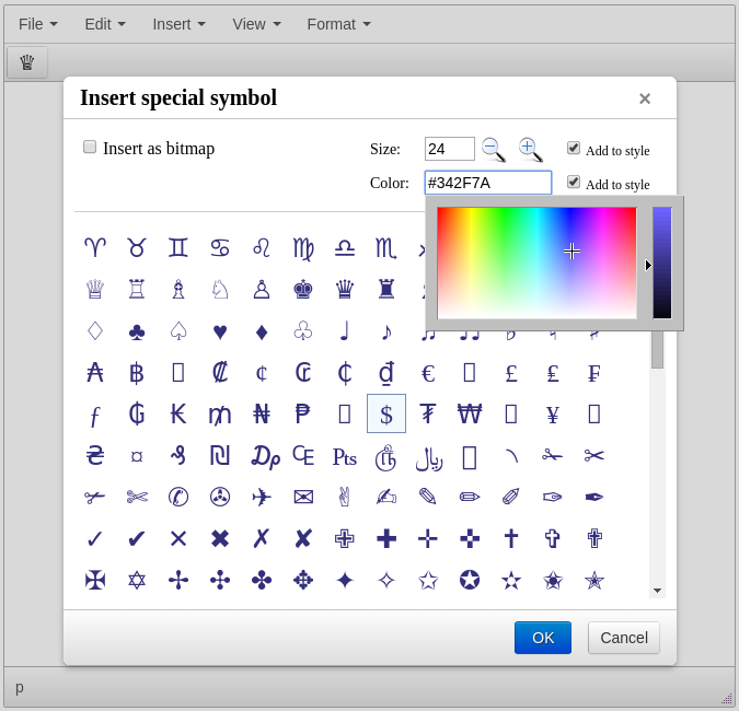 This table of special characters allows inserting symbols as text or image to the content of the site.
