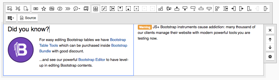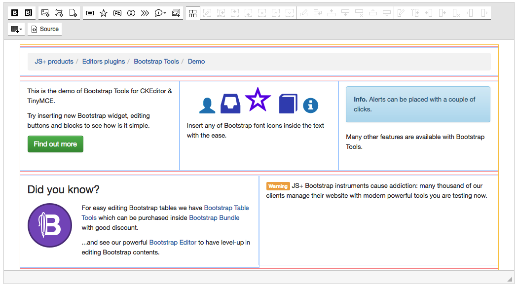 Please note there are some buttons are added on toolbar which refer to Bootstrap Editor features: jsplusBootstrapEditorColConf, jsplusBootstrapEditorColChangeType, jsplusBootstrapEditorColMoveLeft, jsplusBootstrapEditorColMoveRight, jsplusBootstrapEditorColAdd, jsplusBootstrapEditorColDelete.