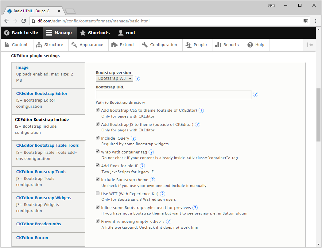 Limit allowed HTML tags and correct faulty HTML. This is required not to stripe out some tags (including table tags). If you skip this step some buttons (i.e. Insert Bootstrap Table Column) will not be even visible on the toolbar.
