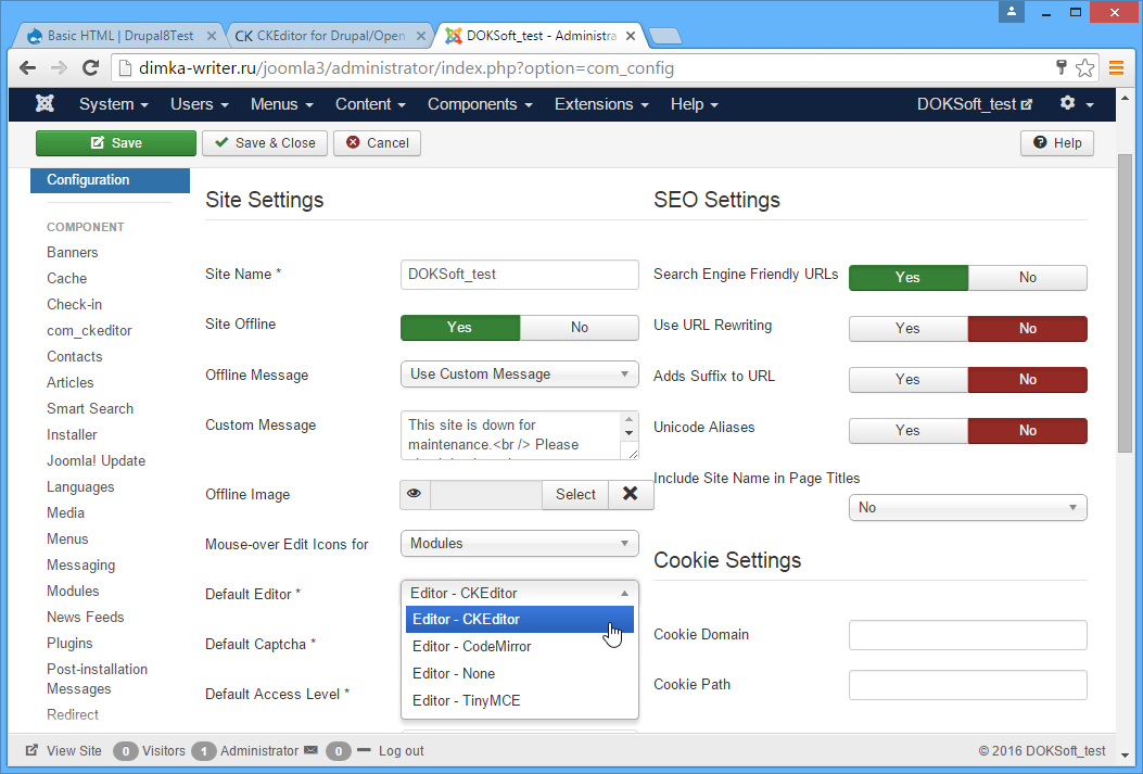 Now, you need to set CKEditor as a default editor in Joomla. Open the “System | Global Configuration” and choose CKEditor as shown on the screen below: