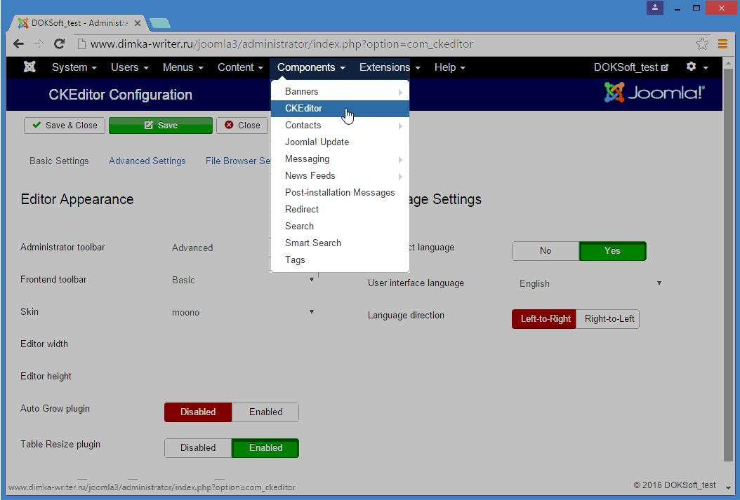 If it doesn’t, you can open CKEditor in your administration panel at any time by using the Components menu: