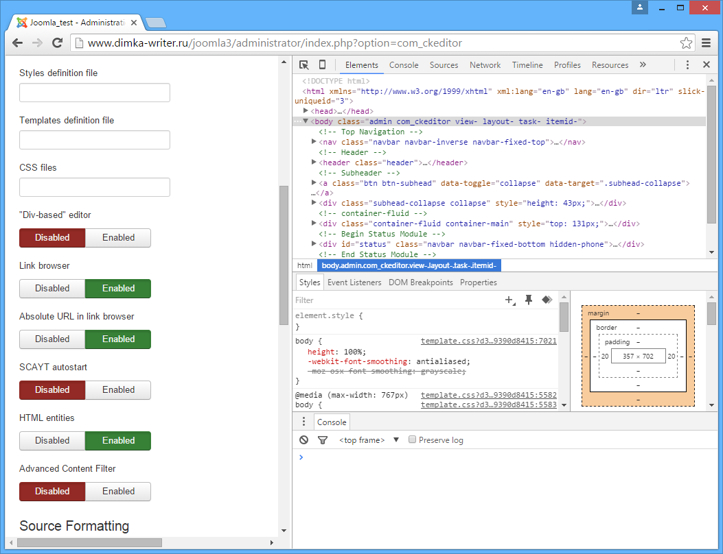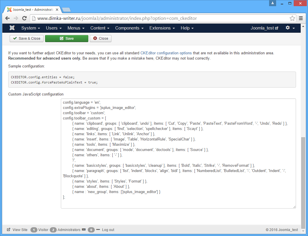 %joomla%/plugins/editors/ckeditor/Installing CKEditor to Joomla 3 may lead to being unable to save its settings using the Joomla Components dialog. The problem is as follows: whenever you click the “Save”, “Save and Exit” or “Close” buttons nothing happens. This is too bad, because now you cannot install a plugin to CKEditor, nor can you adjust default settings of CKEditor itself.
