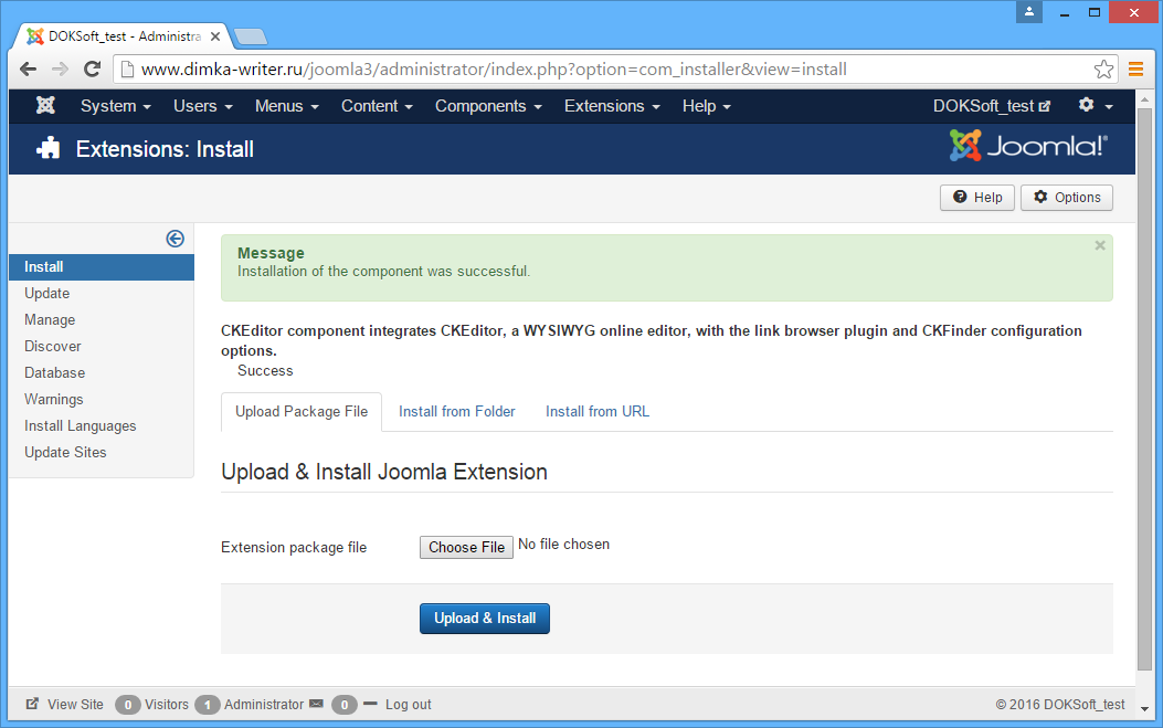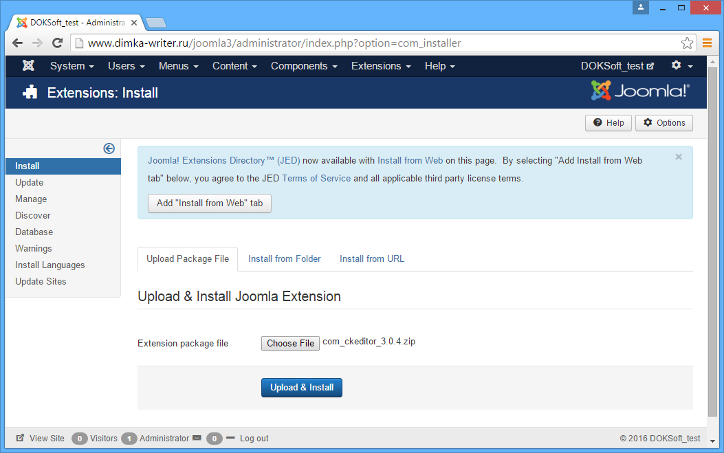 We need the first option: “Upload Package File”. Click the “Choose File” button and select the Joomla package you downloaded on Step 1. Then click the “Upload & Install” button. Joomla will start uploading the file and installing CKEditor.