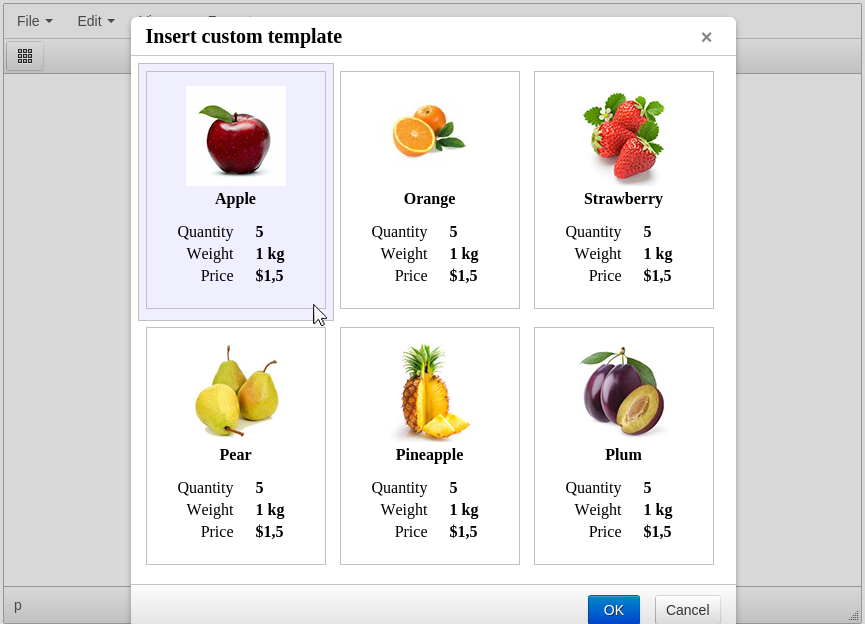 Define your own HTML templates and this plugin will show them in a popup (dropdown menu) or in the dialog for your choice. Selected template immediately is being inserted to an area of CKEditor & TinyMCE.