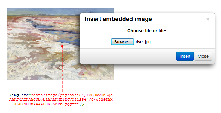 CKEditor & TinyMCE Image Embed is a plugin for direct inserting images into HTML without their uploading to the server. This is standard HTML feature currently is supported by all popular browsers.