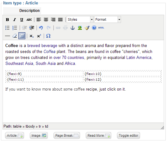 Joomla Flexicontent Anywhere is a plugin for your Joomla 2.5 allows you to insert Flexicontent article rendered with its default template or any items' fields into any place of your pages.