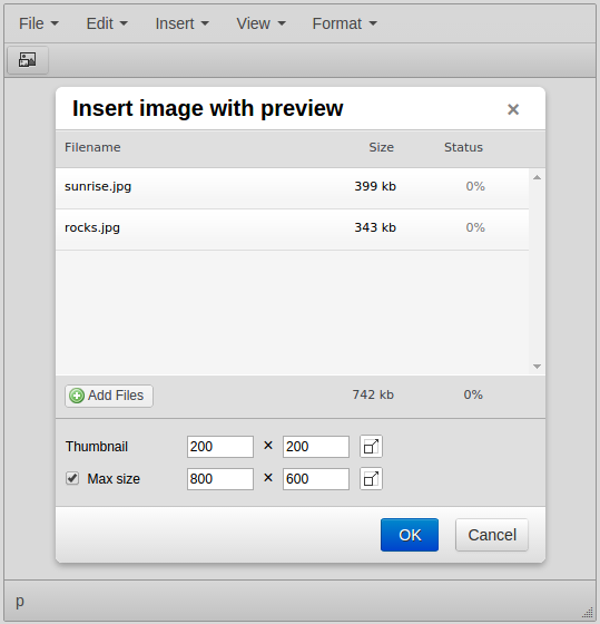 CKEditor & TinyMCE Quick Image Preview allows user uploading images to a server and paste their previews with a link to a full image. Uploading process is very easy, the same as in CKEditor & TinyMCE Quick Image Upload add-on. It does not require selecting image in any server file manager after uploading. Just select the file in the standard open file dialog and it will pasted into the document.